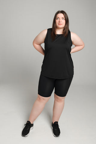Well Fit Activewear. Female model wears black compression shorts that fall above the knee. The shorts have a pocket on each leg that is big enough for phone, keys, debit card, even a banana as well! Well Fit tops and shorts are available in UK sizes 8 to 30. Free shipping over £100. Jasmine, model, wears UK size 8. She is side on to the camera wearing black baseball cap, Well Fit vest and Well Fit compression shorts. Jasmine holds the waistband to show high waist.